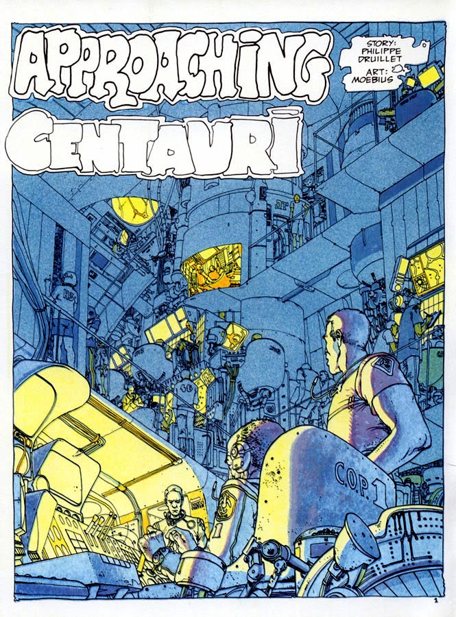 Για να επανέλθουμε στα comics, η ιστορία του Moebius απ'την οποία προήλθε το εν λόγω εξώφυλλο είναι η 6-σέλιδη Approaching Centauri, την οποία σχεδίασε σε σενάριο του εξαιρετικού δημιουργού και τότε φίλου του Philippe Druillet, με τον οποίο είχαν πρόσφατα ιδρύσει το θρυλικό περιοδικό Métal Hurlant. To Approaching Centauri (Approche sur Centauri) δημοσιεύθηκε μάλιστα στο 1ο τεύχος του περιοδικού τον Ιανουάριο του 1975, και το 1977 και στο αμερικάνικο αντίστοιχό του, το Heavy Metal (ίσως επειδή λεγόταν έτσι το περιοδικό να σκέφτηκε ο εικονογράφος του Hell Awaits να το χρησιμοποιήσει - μπάααα!). Mετέπειτα οι δυο μεγάλοι δημιουργοί τσακώθηκαν και δεν ξανασυνεργάστηκαν, οπότε η συγκεκριμένη ιστορία αποτελεί ένα σπάνιο παράδειγμα κοινής τους δουλειάς. Ας το δούμε λοιπόν.